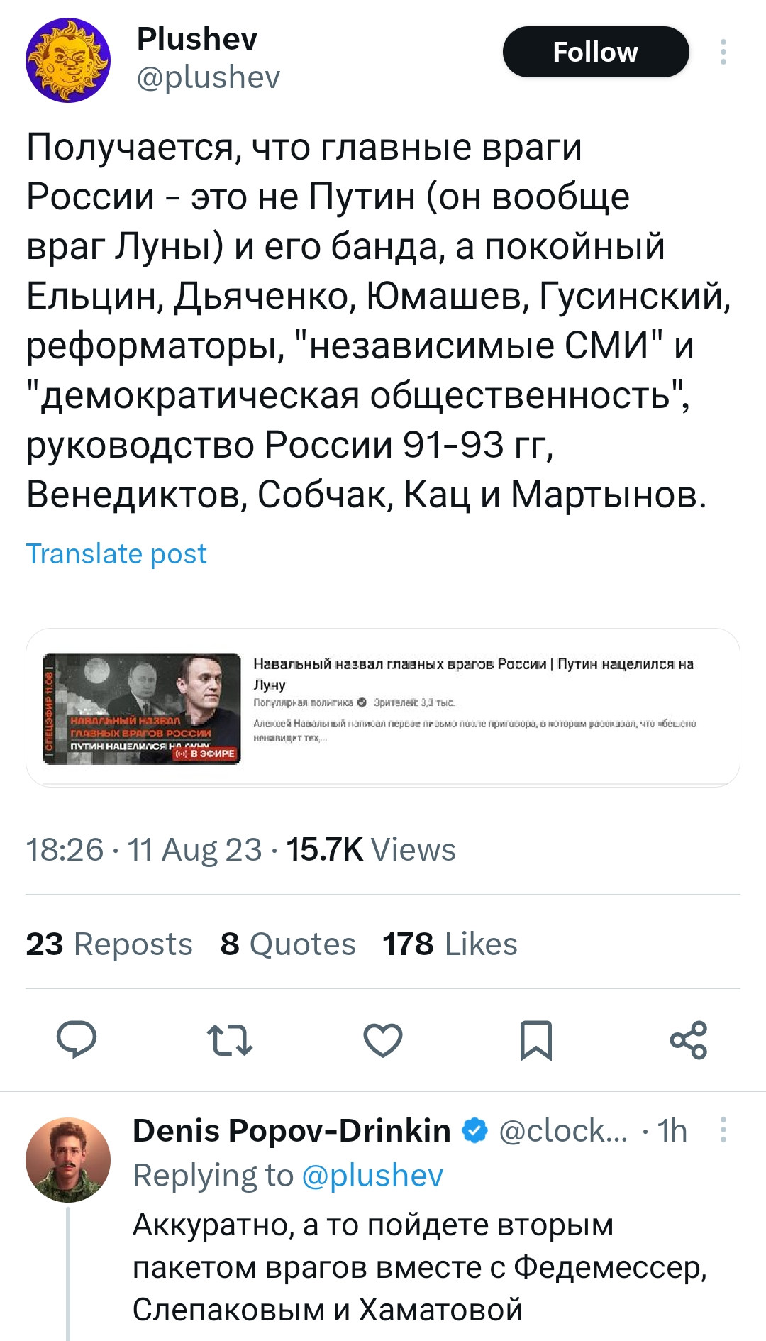 Или "Поэтому ничего я не могу с собой поделать и люто, бешено ненавижу тех, кто продал, пропил, растратил впустую тот исторический шанс, что был у нашей страны в начале девяностых. Ненавижу Ельцина с «Таней и Валей», Чубайса и всю остальную продажную семейку, которые поставили Путина у власти." А того, кто увел народ с митинга, чтобы они не пошли брать Кремль, он не ненавидит? Тот еще за это получил допуск на некие выборы, ЕР за него подписи собирала.