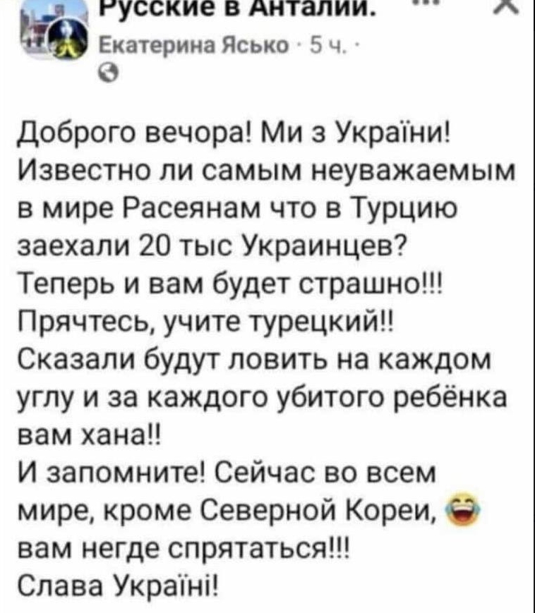 И вижу, что можно написать stop russian invader, а можно просто - kill russian. Нельзя написать - kill all russians women, но вот Kill russian можно, в контексте войны. И это неверно, именно потому, что как ни странно, увеличит поддержку путинской агрессии.