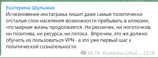Исчезновение инстаграма лишит даже самые политически отсталые слои населения возможности пребывать в иллюзии, что мирная жизнь продолжается. Ни ресничек, ни ноготочков, ни позитива, ни ресурса, ни потока. Впрочем, это же должно обучить их пользоваться VPN - а это уже первый шаг к политической сознательности.