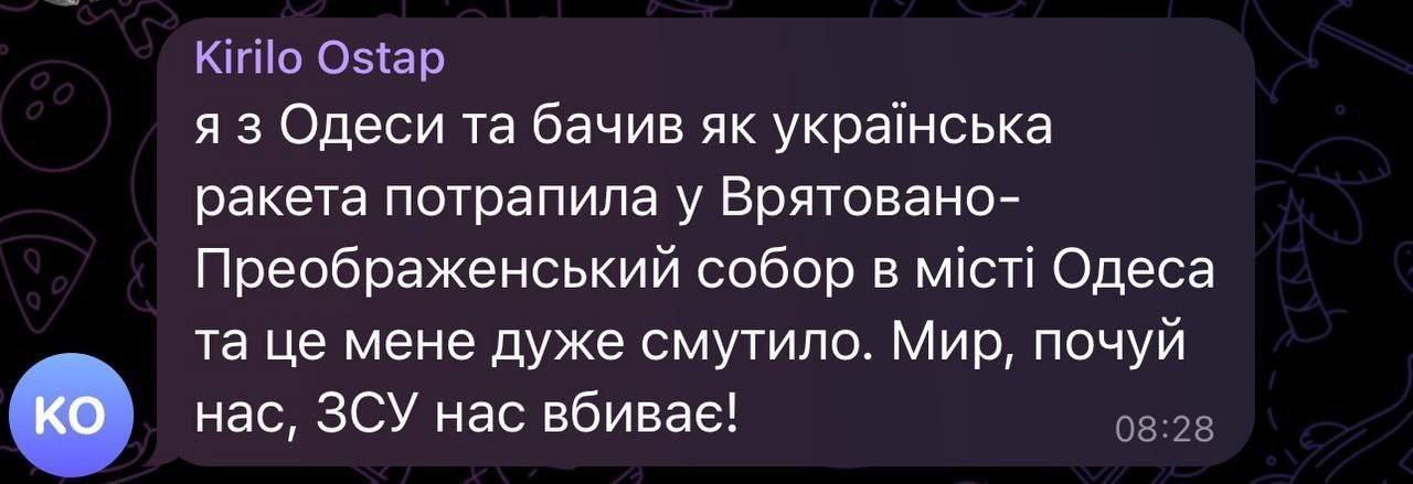 "Русские твари попали в собор, который строила вся Одесса. Попало прямо в алтарь, все в хлам просто разрушено. Собора больше нет ... спасибо, русские братья ... спасибо, ваша святость (предположительно, речь идет о патриархе всея Руси Кирилле – УНИАН), что вы попали в самое сердце митрополита Агафангела (настоятель храма – УНИАН). Богородица вам этого не простит"