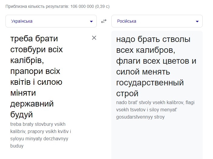 ЗЫ: для носителя языка фраза "треба брати стовбури всіх калібрів, прапори всіх квітів і міняти державний будуй" звучит как "надо брать стебли всех калибров, флаги всех цветочков и менять государственный сооружай".