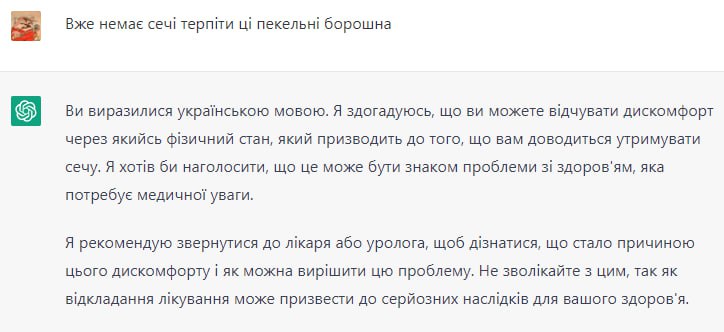 Из-за этого возникают ситуации, когда пропагандист на службе должен по заданию выдавать себя за "рядового обеспокоенного гражданина" и носителя другого языка в целях создания нужного эмоционального фона, дезинформации и навязывания нужных заказчику мнений, но языком не владеет и пользуется автоматическим переводчиком. Тогда появляются перлы типа "немає сечі терпіти ці пекельні борошна" - нет мочи (в смысле поссать) терпеть эти адские муки (в смысле, из чего тесто делают). Бонусом идет то, что для украинца совершенная бессмыслица и ржачная белиберда после гуглоперевода звучит совершенно правильно и естественно на русском. Это позволяет выявлять самозванных "простых украинцев" из ольгино: если он на словах "час стиснути волю в куркуль" не запнулся и не насторожился - значит он бот, который украинский текст пропускает через программный переводчик, чтоб его вообще понять.