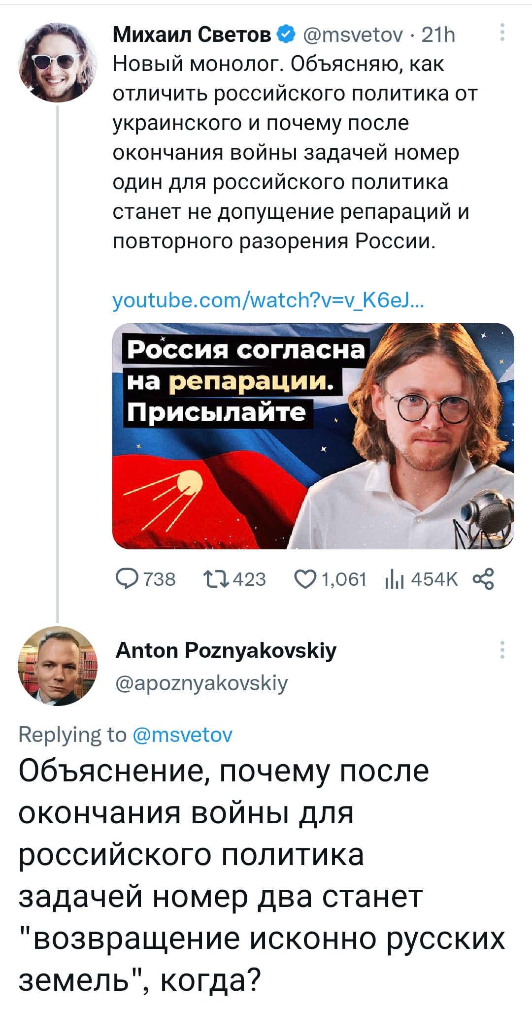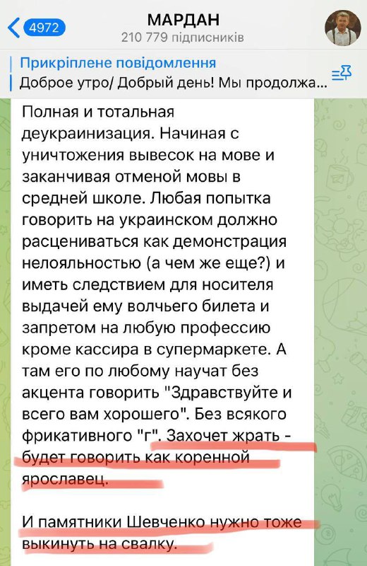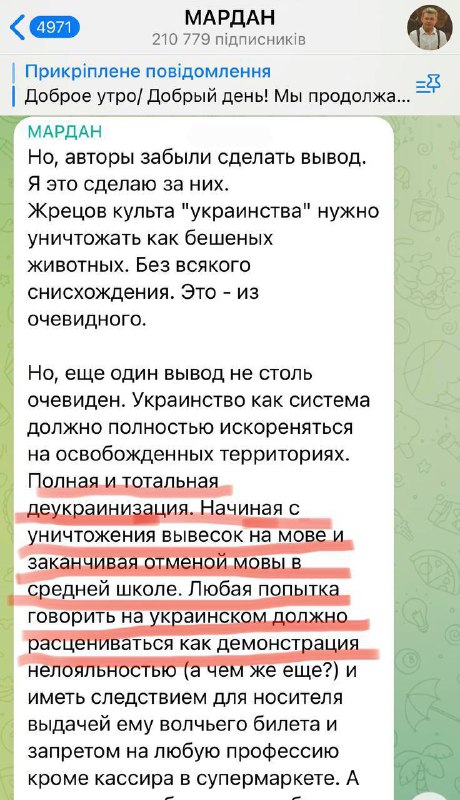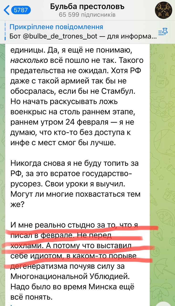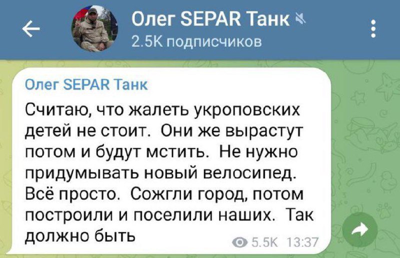 Я знаю, что даже если завтра все московско-фашистские войска покинут международно признанную территорию Украины, включая Луганск и Севастополь, россияне будут праздновать победу и злорадствовать над украинцами: ведь Украина лежит в руинах, а Россия нет, Украина жестоко наказана, а Россия преподала всему миру урок и показала силу!