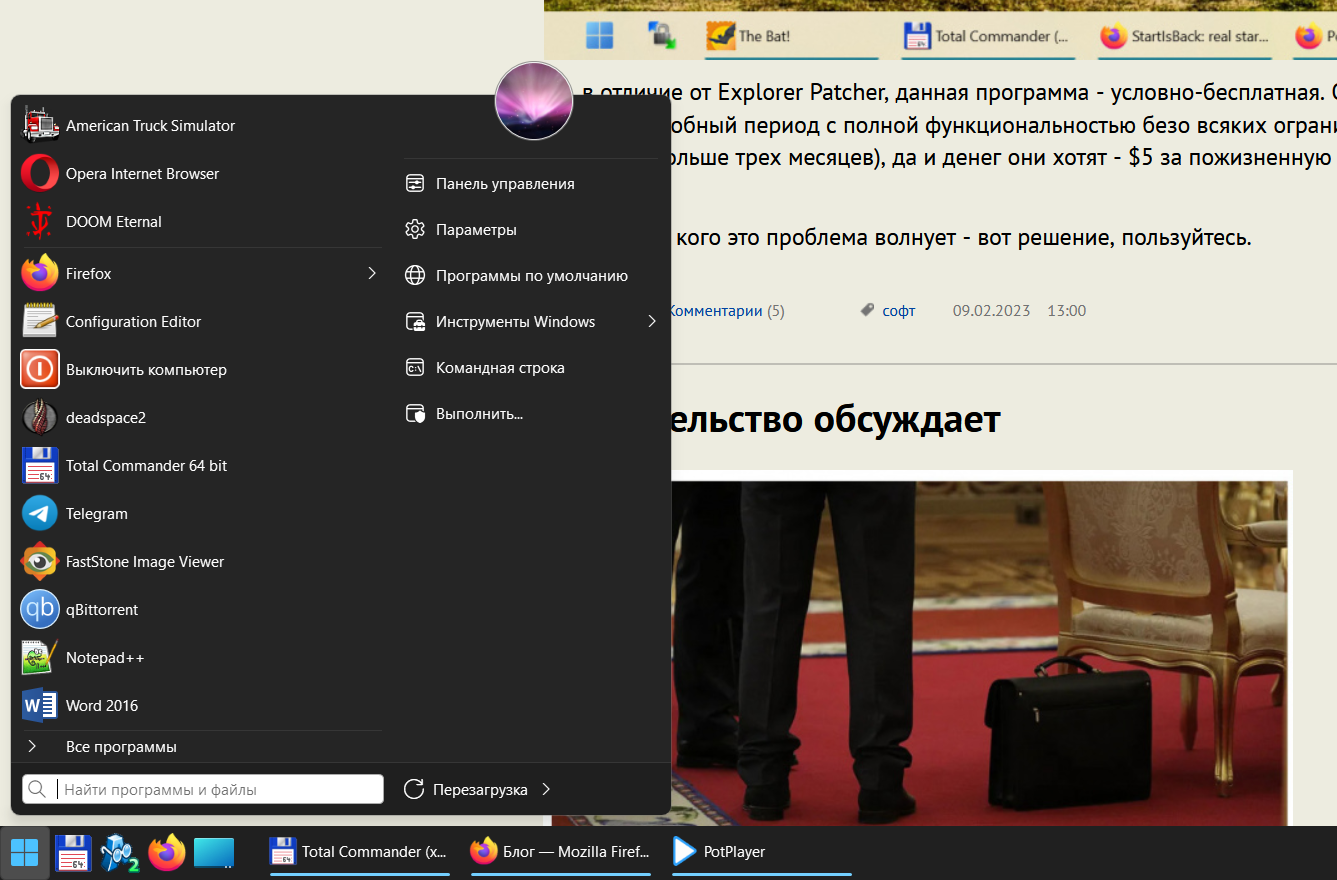 Ну и по поводу ExplorerPatcher (он у меня уже установленный и достаточно давно). Только что обновил систему до самого свежего апдейта, плюс специально перезагрузил. Никаких проблем пока не наблюдаю, программа работает как надо.