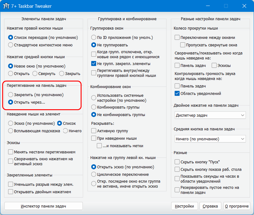 Т.е., опять таки, как я и написал выше, некоторые функции работают через моды Windhawk (я давал ссылку на раннюю версию мода, отключающего группировку).