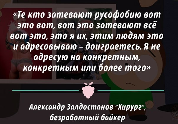 "Те, кто на меня приписывает, в целях подмочить мою репутацию, вот эти псевдослова, которых из меня не было - вы хотите, чтобы я вас таскал по суду? Я устрою. Клеветание, подтасовка речи, шантажество - это ваш либеральный статус скво, которым вы друг у друга гордитесь. Но посмотрим, кто шире сядет. Я так просто этого в себе не оставлю.