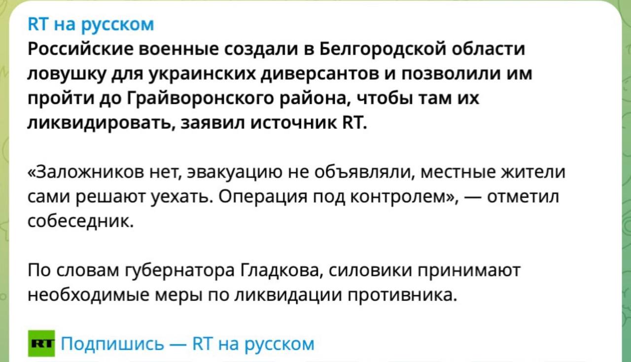 "...под обстрел, в числе прочего, попал контрольно-пропускной пункт «Грайворон», после чего на его территорию со стороны Украины заехал танк ВСУ."