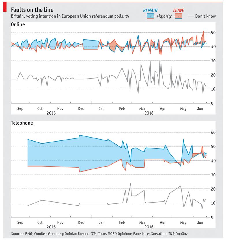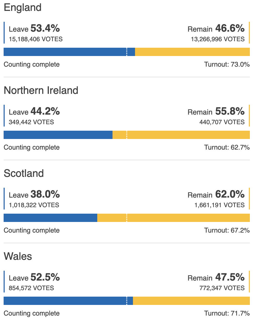 (Голоса за выход из Евросоюза на диаграмме показаны синим цветом.)