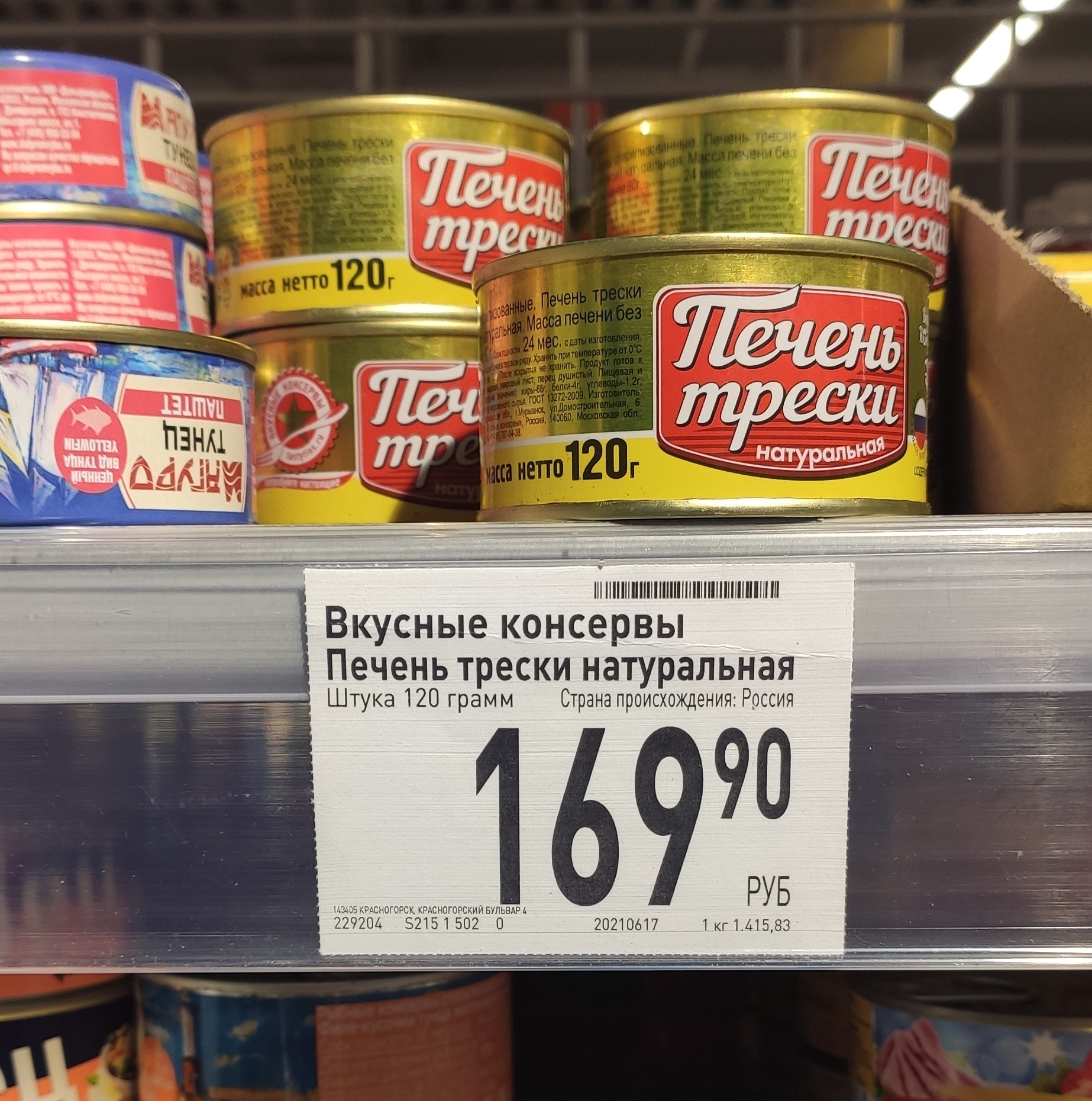 В Украине неплохая печень 120 г за два (бывает и меньше) евро. Что странно, вся она в Исландии сделана, но у разных ТМ качество разное. Бывают огромные розовые куски, бывают обрезки.
