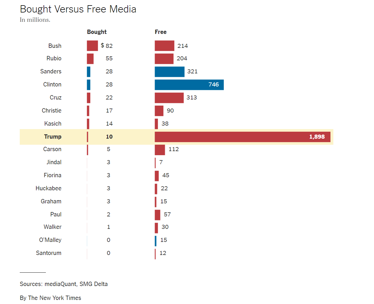 Трамп - гениальный пиарщик. На графике - даннные New York Times, сколько кандидаты в президенские выборы 2016 года платили за рекламу, и сколько у них было бесплатной публичности. Так вот, у Трампа её было почти под два миллиарда USD, что почти в два раза больше, чем у всех остальных кандидатов.