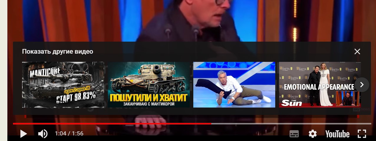конькачаю. А в этом случае пауза нужна, чтобы продолжить смотреть, и это окно бесит и мешает.- обычно конец видео малозначим: титры, благодарности, всякие "пока-пока" зрителям. А в этом случае ролик настолько короткий, что весь тайминг его значим, и опять же окно в конце ролика бесит и мешает.