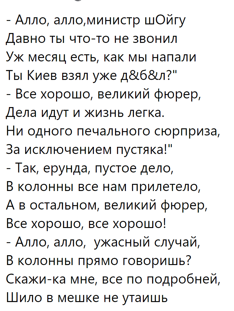 Что за чушь от Арестовича? Чернобаевка давным-давно оккупирована российскими войсками, как и почти вся область, чего ее брать штурмом? Наши бомбят тамошний аэропорт. В то, что россияне от бомбардировок аэропорта дружно начали драпать из города я тоже не верю. Они пытаются аннексировать нас, похищают гражданских, стреляют резиновыми пулями по митингующим, блокируют подвоз еды и лекарств, и по сообщениям инсайдеров из ФСБ готовы начать "большой террор" против недовольных.