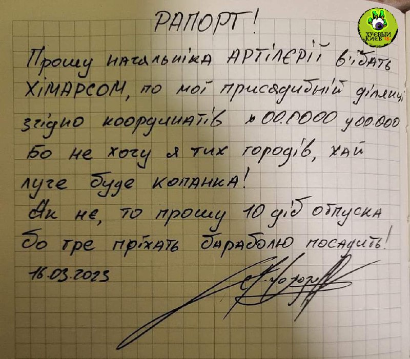 Прошу начальника артиллерии въ**ать химарсом по моему приусадебному участку согласно координат х00000 у00000. Потому что не хочу я тех огородов, пусть луче будет пруд. Если не, то прошу 10 суток отпуска, бо надоть приехать картоху посадить!