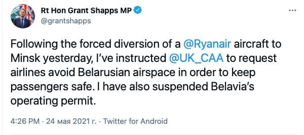 Надо Rayan Air просто иметь инструкцию "если экстренно садиться, то удостоверьтесь, что это не над территорией беларуси. Тогда садитесь в Польше, Украине, или Прибалтике"