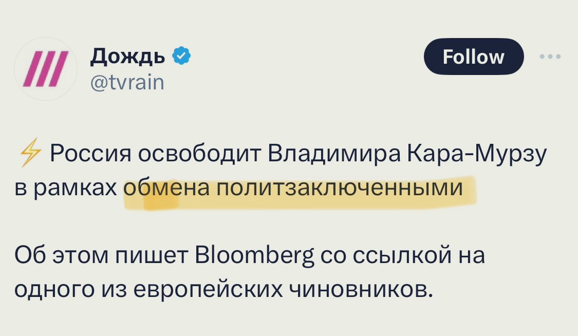 При том, что я безумно рад, что реальным политзаключённым удалось вырваться из ада, сама эта акция вызывает полное недоумение своей нелогичностью. Как освобождение Ходорковского и разрешение на вывоз отравленного Навального. Причём к тем акциям ещё как-то можно притянуть вялое желание чемоданного сруля сохранить видимость лица, то сейчас это вообще странно. Но люди освобождены и это главное! Особенно рад, что в список попала Саша Скочиленко.