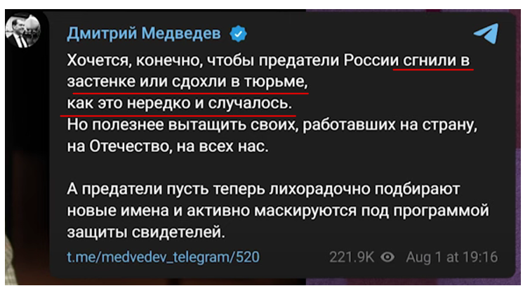 «А предатели пусть теперь лихорадочно подбирают новые имена и активно маскируются под программой защиты свидетелей», — написал Медведев в своем телеграм-канале»