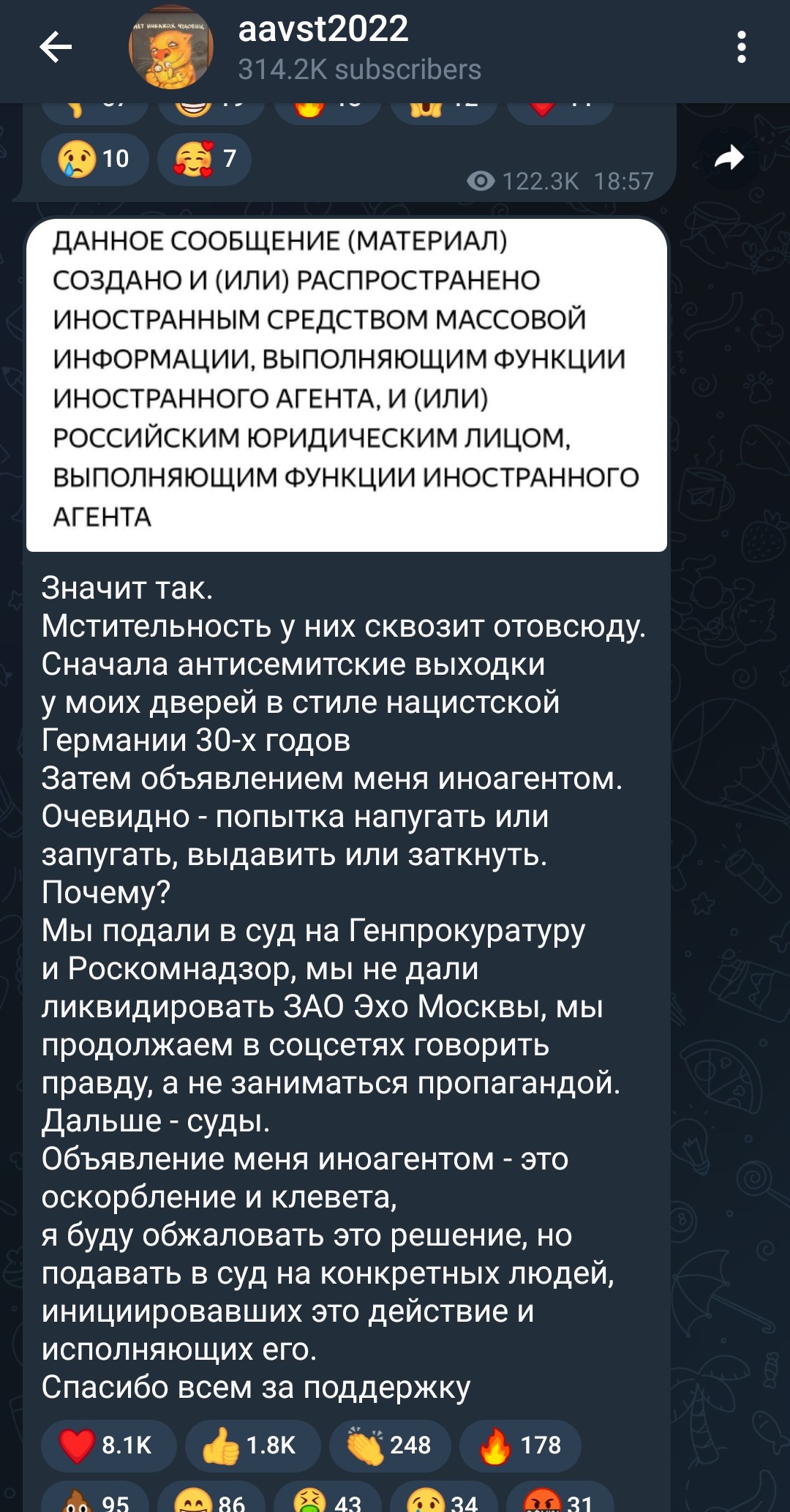 Теория подтвердилась, Венедиктов перед каждым постом вставляет сообщение про иноагента. Он хочет обратно, в легальные РФ-сми, и надеется что, наклеив жёлтую звезду, он покажет, что лоялен. Дичь какая-то.
