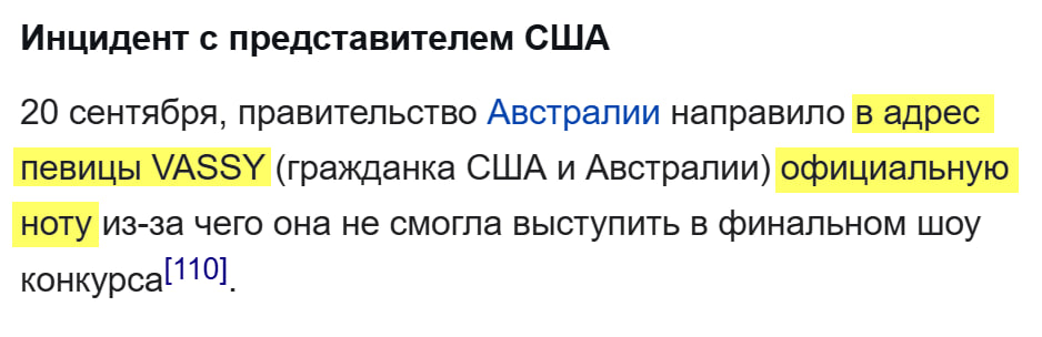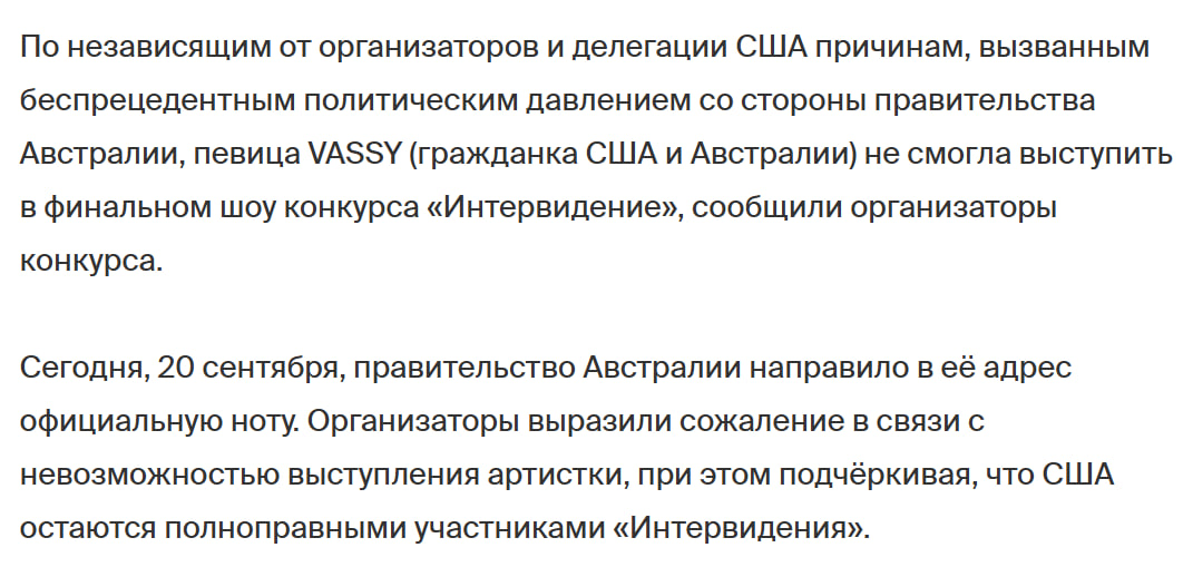 На Вики написано, будто Австралия прислала "официальную ноту" ЛГБТ амбассадорке Vassy. Но такие ноты можеть прислать лишь одно государство другому государству. Представлять она должна была США, так что Австралия тут никаким боком не могла ей запретить (да и не знала, думаю).