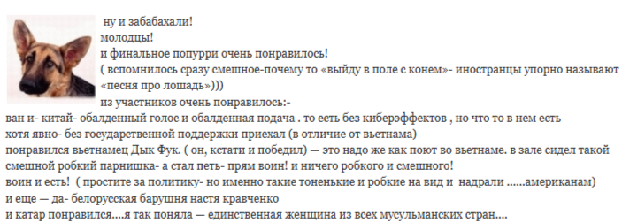 Вот такие мысли. По мне так конкурс провалился. Особенно покоробило от блока со старыми советскими песнями из прошлого тысячялетия. ЗАЧЕМ? Нахрена?