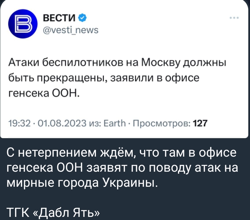 "Вопрос : Пара вопросов. Во-первых, в минувшие выходные Московский финансовый район подвергся атаке дронов. Российское правительство утверждает, что там находятся украинские беспилотники. Какова реакция Генерального секретаря на этот инцидент?