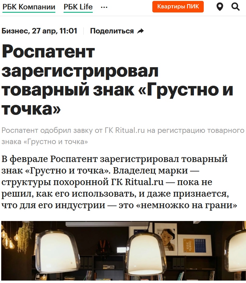 1 февраля 2023 года ООО «Ритуал.Рус» (входит в ГК Ritual.ru) получило регистрацию товарного знака «Грустно и точка», следует из данных Роспатента. Бренд зарегистрирован со сроком действия исключительного права до августа 2032 года по пяти классам международной классификации товаров и услуг.