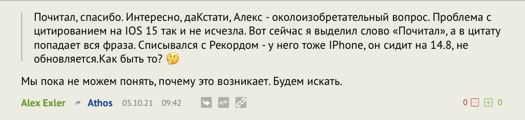 Плюс хотелось бы увидеть решение проблемы цитирования на устройствах с iOS 15 и выше. ?