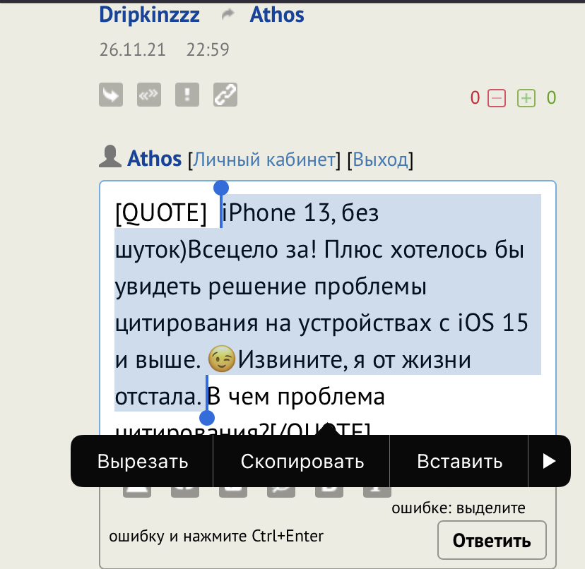 " Раньше, до обновления iPhone на iOS 15, я выделял интересующий меня фрагмент текста, нажимал на кнопку со значком кавычек (цитирование) и писал вам ответ.