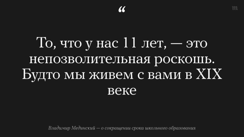 «Оно [образование] должно быть спрессовано, чтобы потом раньше вступать в сферу профподготовки и быть конкурентоспособным, а не начинать в 19 лет размышлять, чем бы заняться. Все будет раньше и быстрее», — цитирует слова Мединского ТАСС.