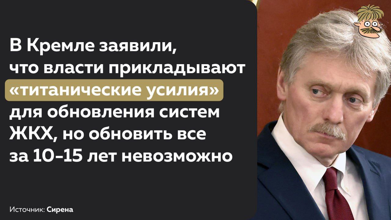Пресс-секретарь президента Дмитрий Песков объяснил проблемы с отоплением в разных регионах России аномальными морозами и износом систем ЖКХ, на ремонт которых требуется время. Также Песков отметил, что работа чиновников и профильных служб претензий не вызывает — они «делали все, что можно делать, был приложен максимум усилий».