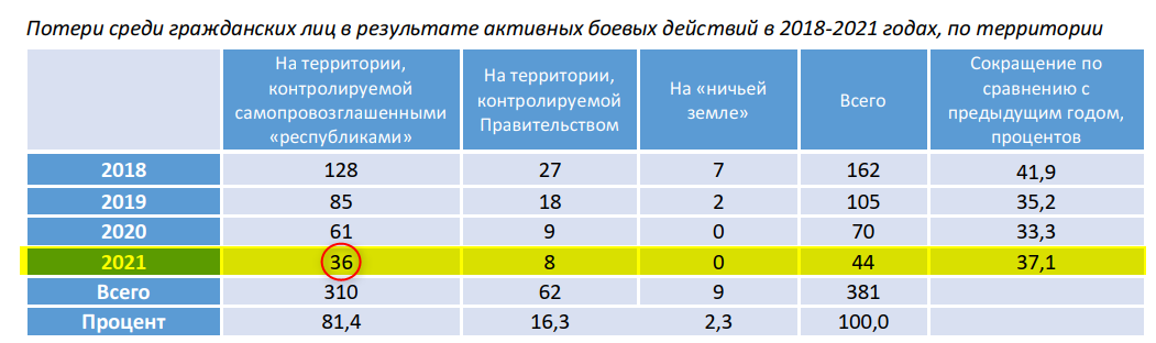 Для справки - за весь 2021 год, по официальной информации ЛНР/ДНР, погибло 8 (восемь) "мирных жителей домбасса".