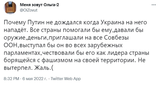 С ужасом наблюдаю как "народ" обсуждает эти указы, и восхищается мудростью Путина, и это не стёб. Большая часть населения РФ не имеет никакой информации кроме ТВ, и верят этому как дети, радуются, и строят планы. То что их планы на 2022 жёстко обосрались, они не замечают. Мне тут один такой рассказывал что он собирается машину покупать к лету, и на вопрос какую ответил - так запустят производство, и буду выбирать. Незамутненное сознание. 😒