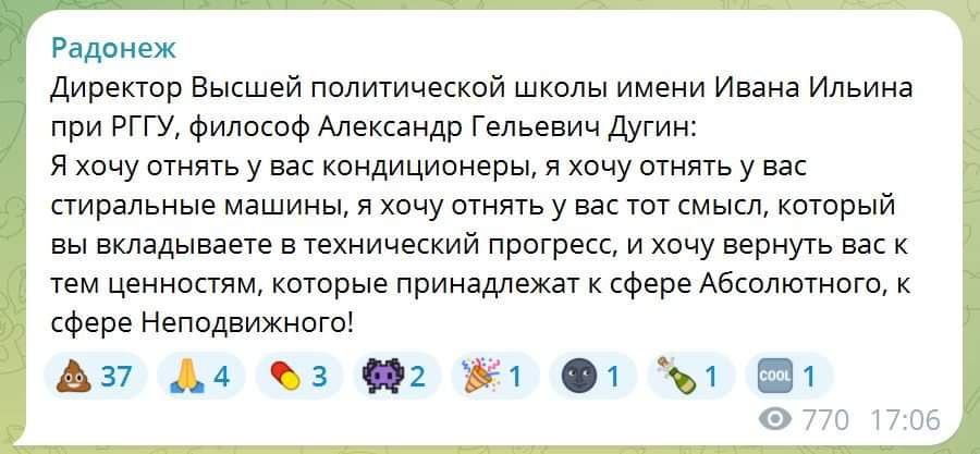 Александр Гельевич Дугин открыл ноутбук, сделанный в бездуховной капиталистической стране, вошёл в сеть интернет, сделанную в бездуховной капиталистической стране, и сообщил миру, что всё это следует закрыть, запретить и заменить на шишки, коренья и прочие духовные ценности абсолюта.