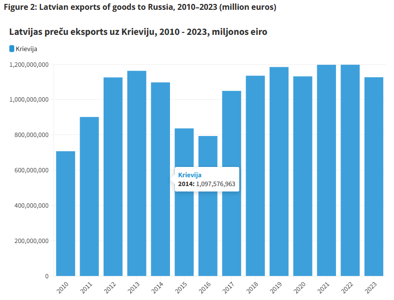 Экспорт товаров из Латвии в Россию в последние годы, включая 2022 и 2023 года, в финансовом выражении практически не изменился, написал объединенный новостной портал Латвийского Радио и Латвийского Телевидения 22 марта 2024 г.