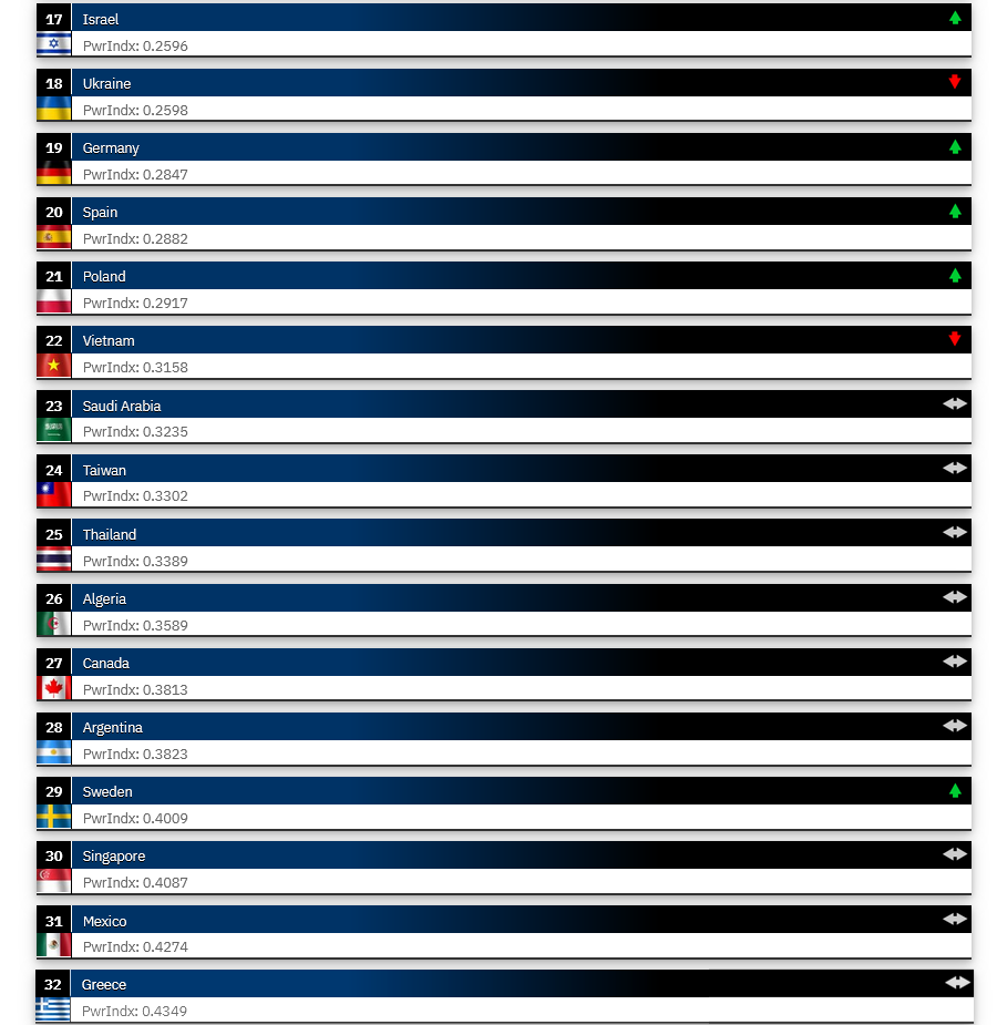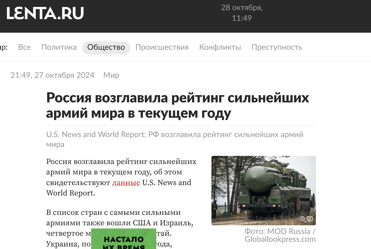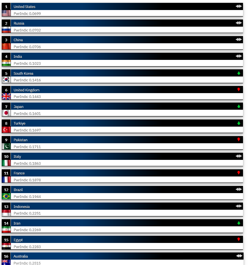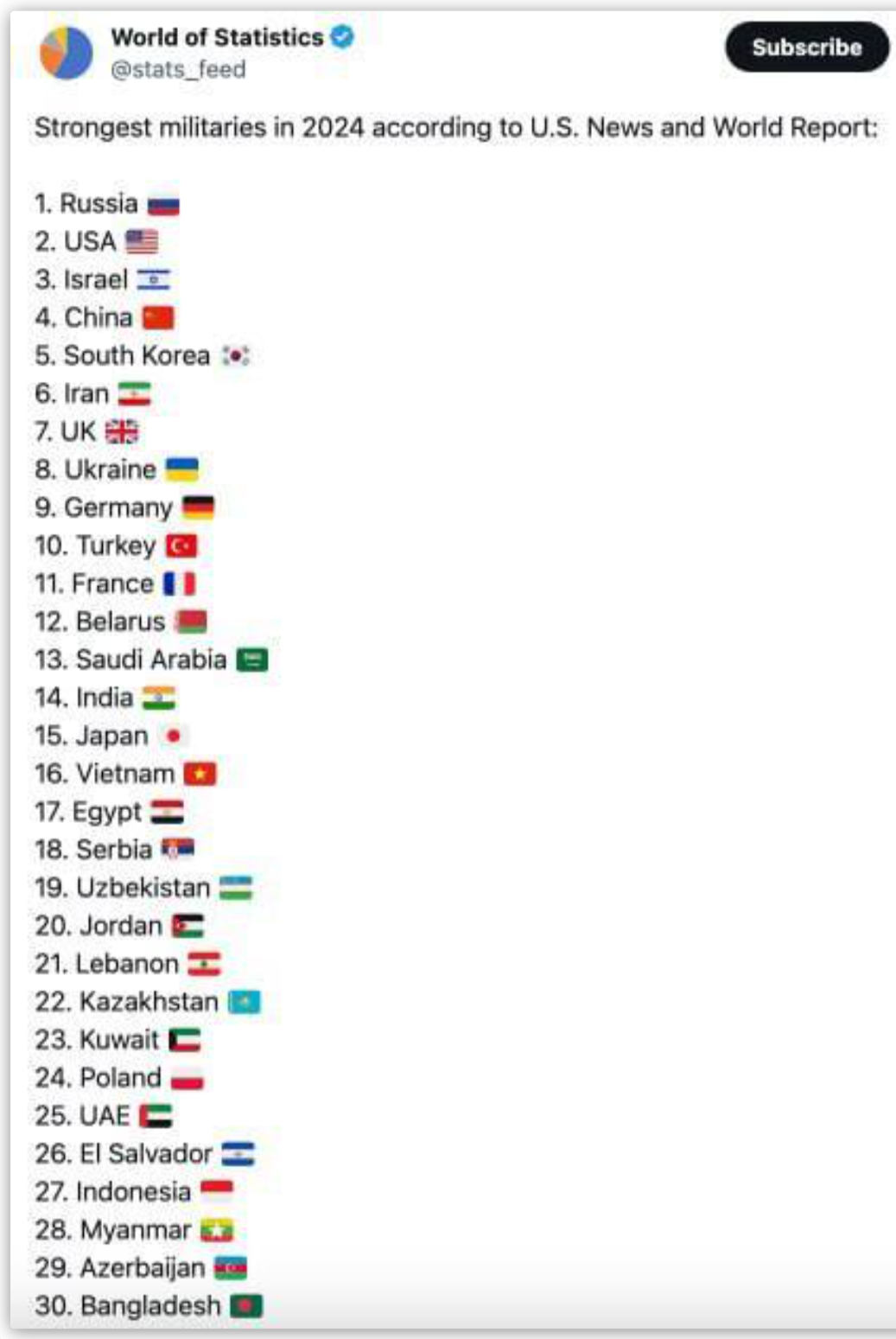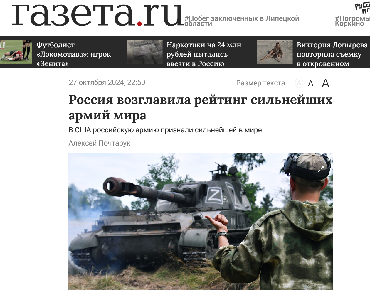 Вопросы возникают только к тому, ПОЧЕМУ опрашиваемые видят армию РФ как самую сильную. А ответ скорее всего кроется в том, что это новости преподают так, причем во всех странах мира. Включая западные страны, где может немного и нагнетают, а может зрители видят, что РФ действует агрессивно, но не осознают какой ценой ей это дается.