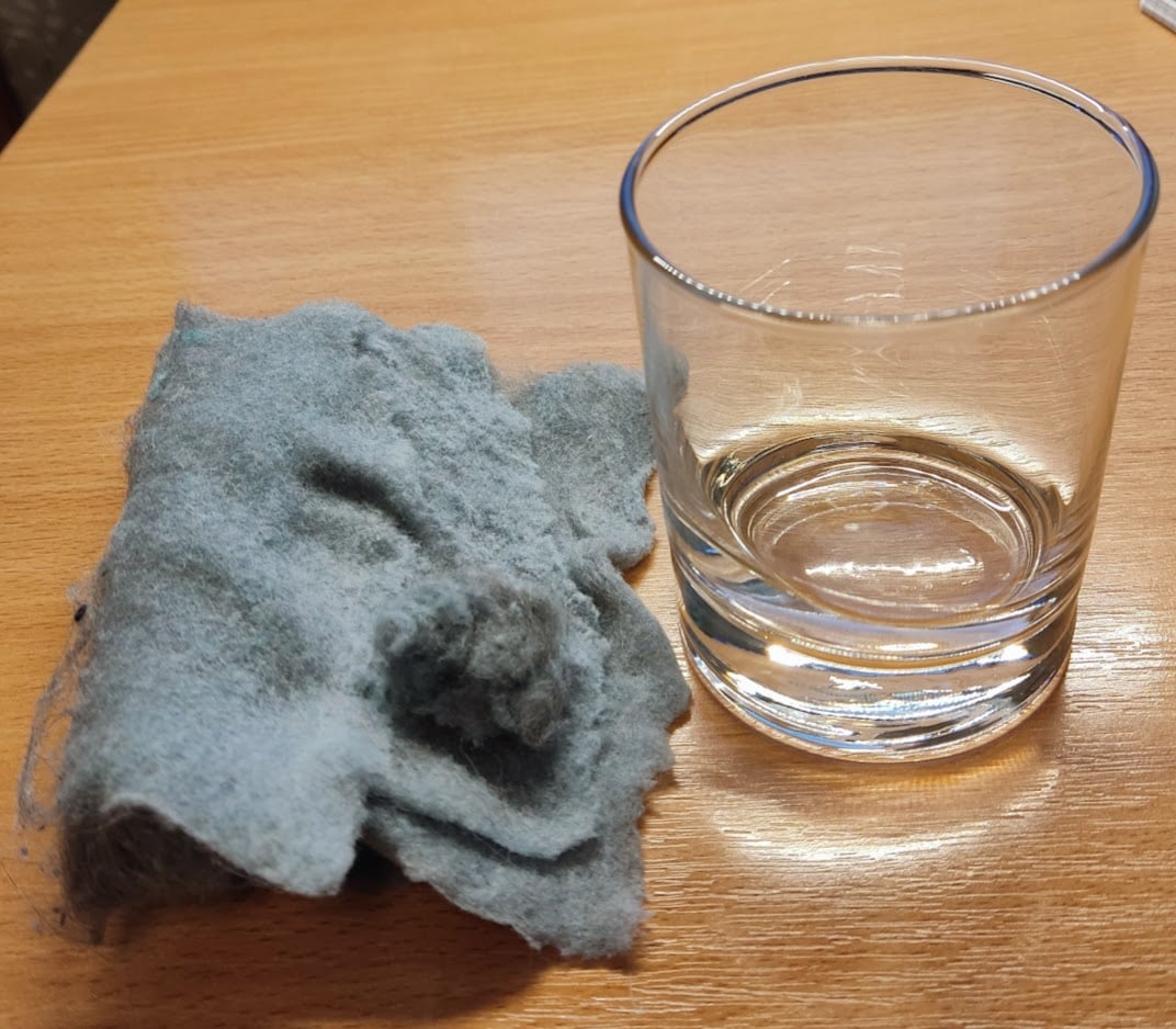 Cамый первый вау эффект - сколько пыли и ворса остается после каждой сушки белья. На фотографии ворс после сушки трех пододеяльников, стакан 200мл для сравнения размера. Количество ворса зависит материала, на хлопке больше, на синтетике сильно меньше.