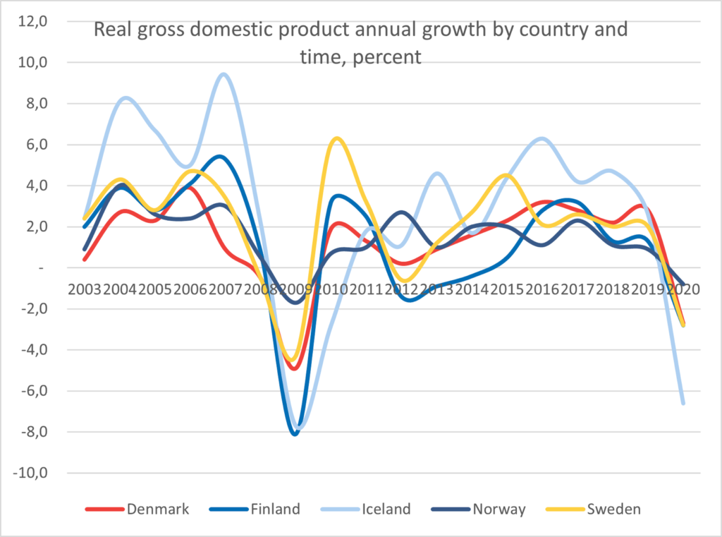 По экономике Швеция ни в каком ни в плюсе: Norway... reported the lowest decline in GDP growth with 0.8 per cent. For the other three countries, the development during the year was similar, a decrease of 2.7 per cent in Denmark and 2.8 per cent in Finland and Sweden.