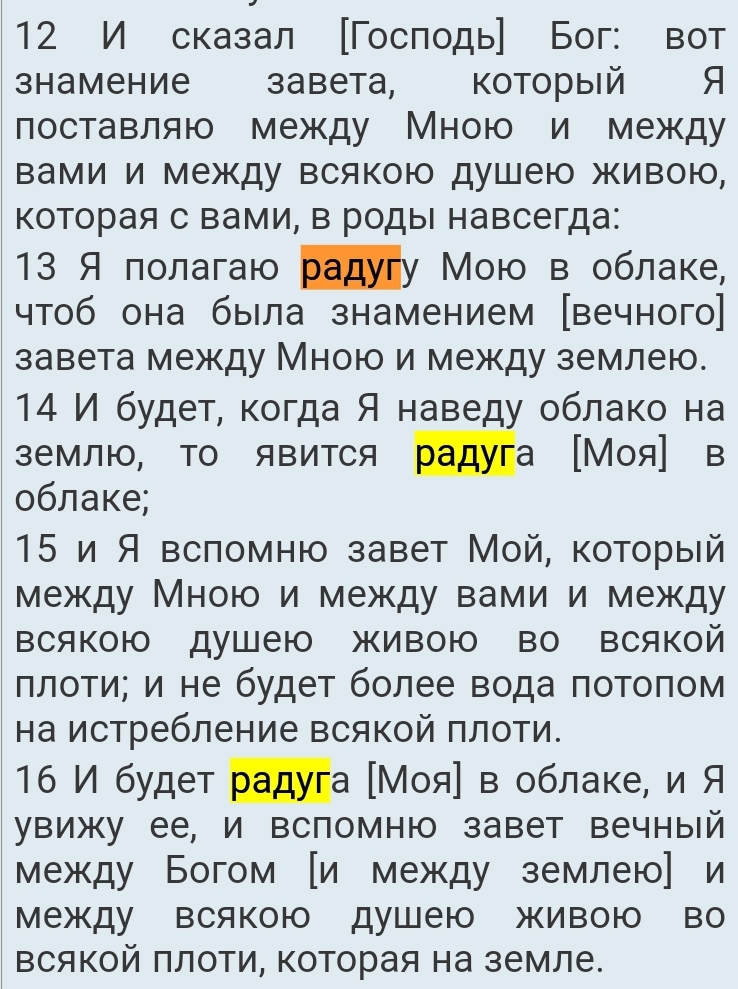Примечательно, что Господь называет радугу Своею. Епископ Виссарион (Нечаев) делает на этом особый акцент, потому что красота ее (радуги) преимущественно свидетельствует о величии Его, как Художника мира, и невольно располагает зрителя к прославлению Его.