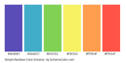 Но не всё так просто. Когда синева представлена только одним вариантом, трактовать её можно по-разному. Ниже две нагугленные шестицветные радуги с кодами цветов. Как видим, и сами цвета и их коды разнятся. В одном случае это голубой, в другом — синий.