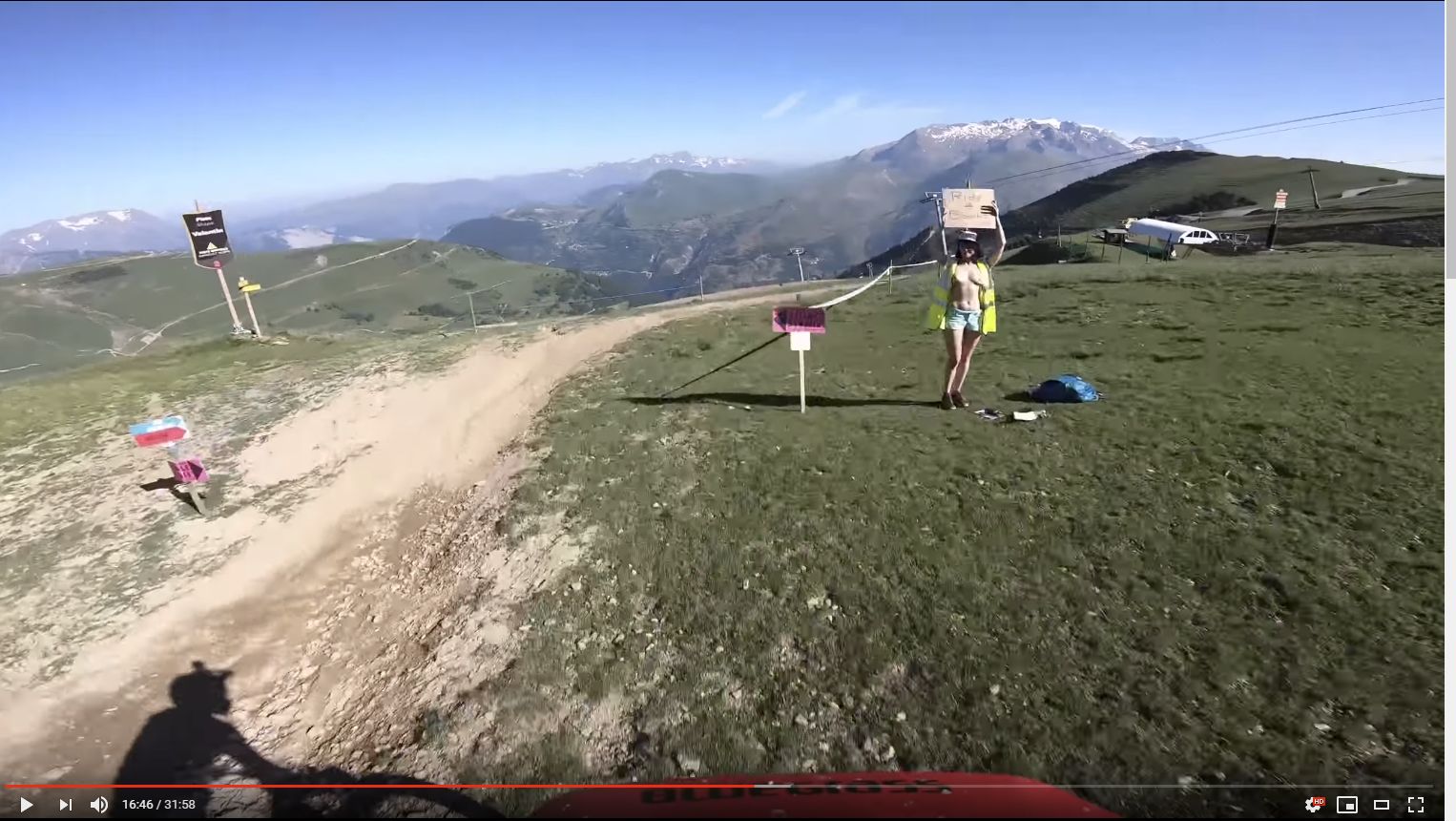 You want to know the funniest part? she wasn't just a random supporter standing there with a sign, notice she's standing next to a blue checkpoint in a vest and walkie talkie on top of the clipboard at her feet. She's one of the on course refs who make sure they go through the checkpoint or they get penalized.