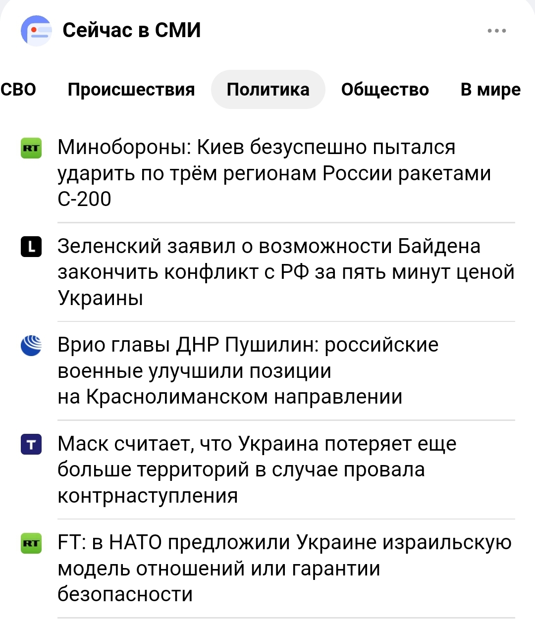 Вот скриншот топа новостей пропутинских СМИ. В то, что по кнопке "СВО" выдаются ровно те же пять, прошу уж поверить.