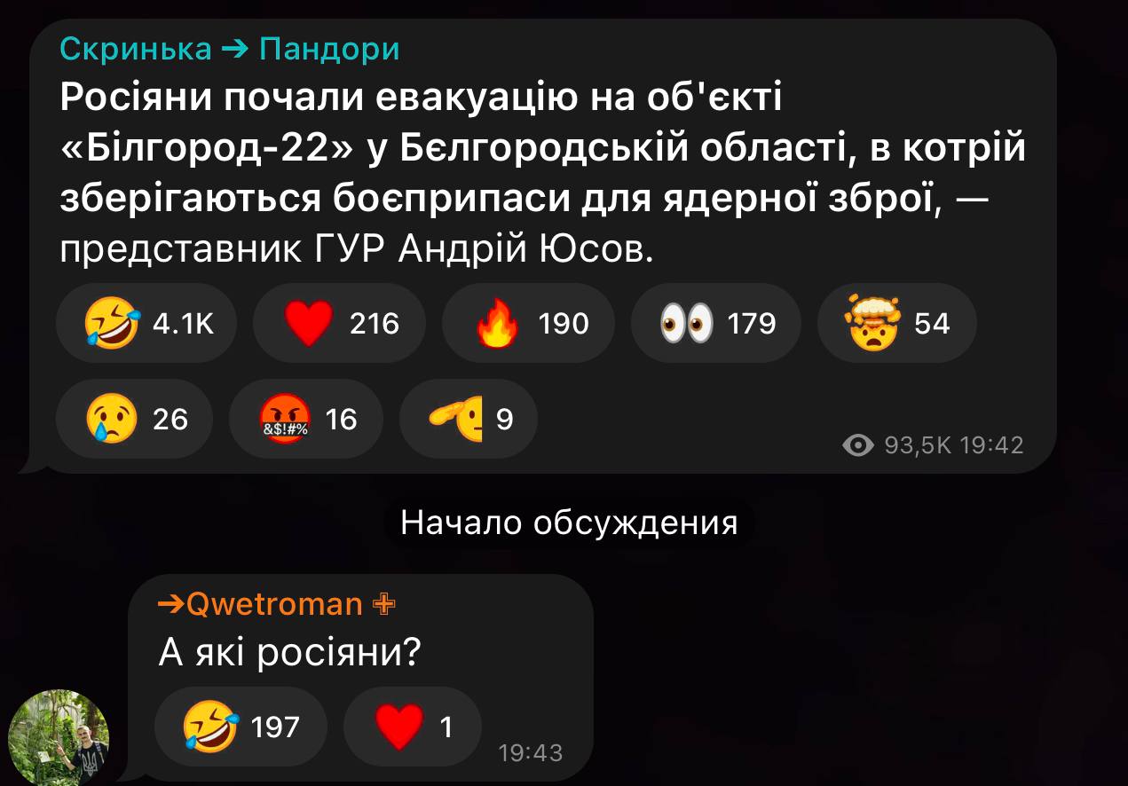 Кроме того, применение ЯО подразумевает крайне высокую степень внутренней концентрации как руководства так и общества. Просто запредельную. По моим ощущениям - это акт коллективного самоубиства, на уровне харакири. Не просто рёв пьяного десантника или мрачное мычание с выпученными глазами турбопатриота. Люди точно знают что и зачем они это делают. Без эмоций. И они твердо двумя ногами на земле а не несут херню про родителей один и два, биолаборатории и боевых комаров. Возня в Белгородской области показывает крайне низкий уровень такой концентрации. А "крыса в углу" - это поведение Промакашки - волки позорные с дальнейшей погрузкой в автобус. Потому что жить хочется.