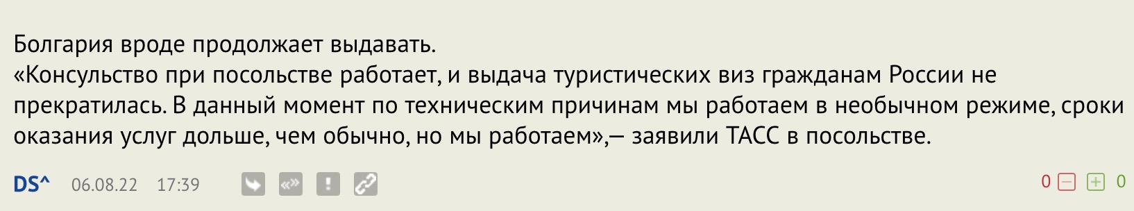 «Консульство при посольстве работает, и выдача туристических виз гражданам России не прекратилась. В данный момент по техническим причинам мы работаем в необычном режиме, сроки оказания услуг дольше, чем обычно, но мы работаем»,— заявили ТАСС в посольстве.