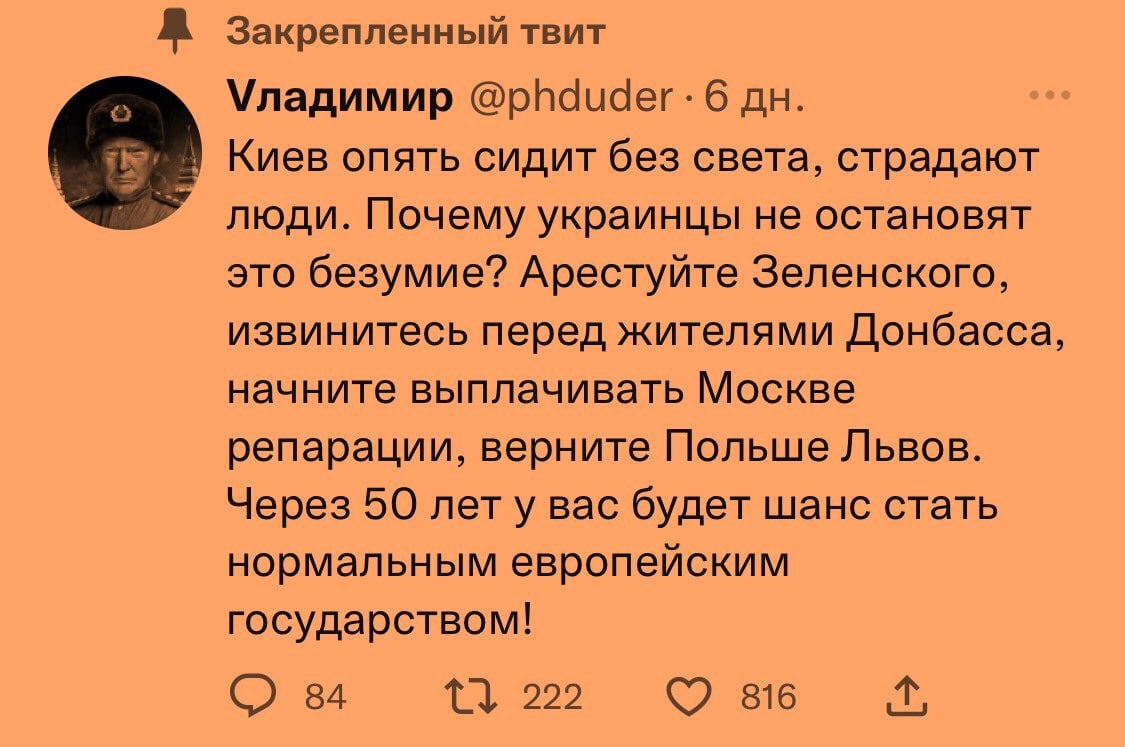 Украинцы вроде как нормальные мужики. Белые, занимаются сексом с женщинами, молятся, постятся и слушают свой аналог радио "Радонеж", закусывают горилку салом и копают уголёк. Но коварный Запад их обманул, и они сейчас воюют за BLM, ЛГБТ, сатанистов, зожников, веганов и экоактивистов. Украинцы должны были бы припасть к Путину, который защищает их, украинские ценности (выделены выше курсивом), но не припали.