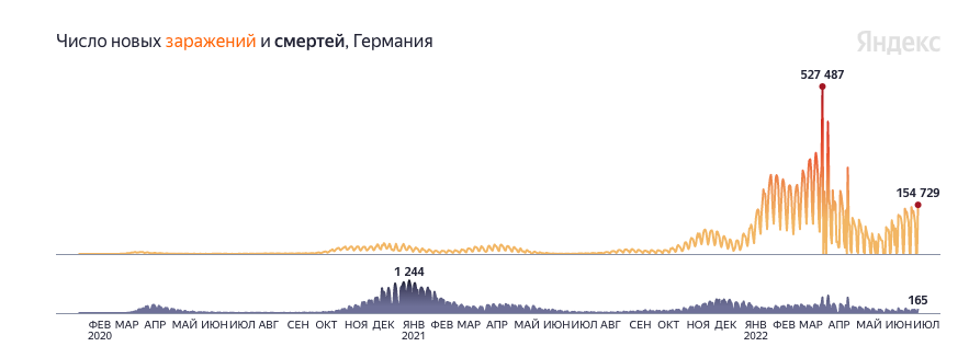 Вот, например, в Германии (почти поголовно привитой) заражений и смертей в день больше в разы, чем было летом 2020 и летом 2021.