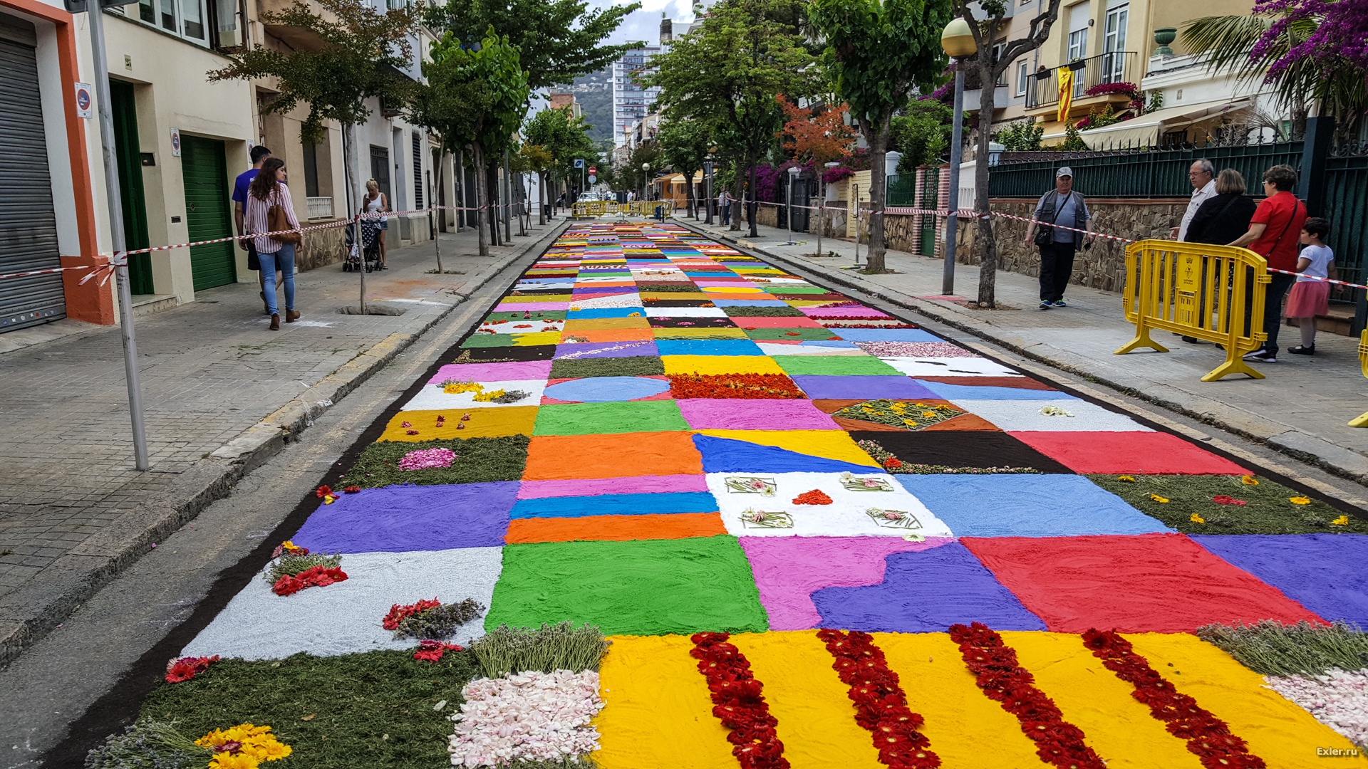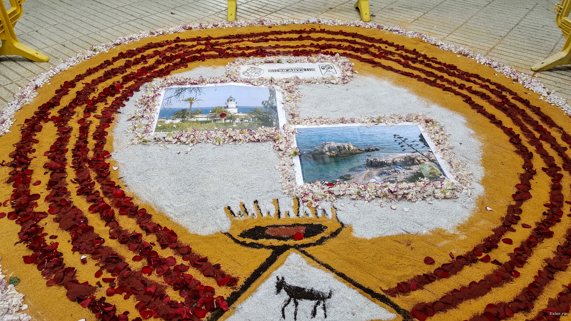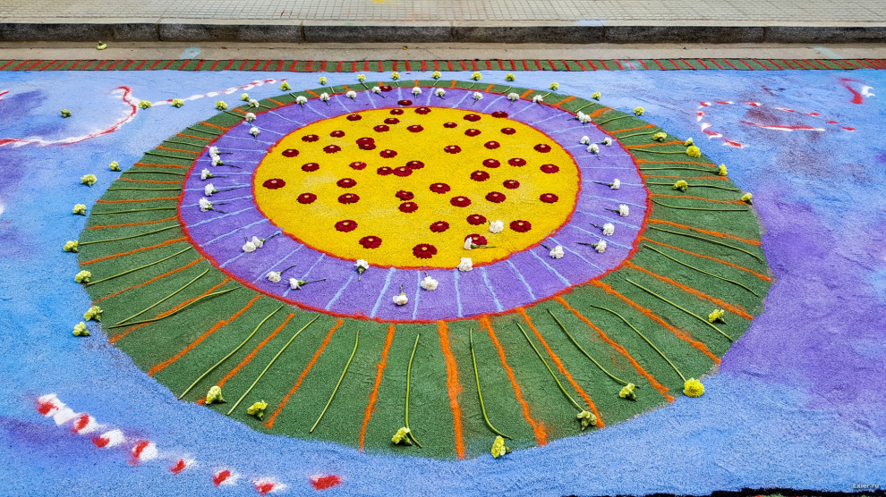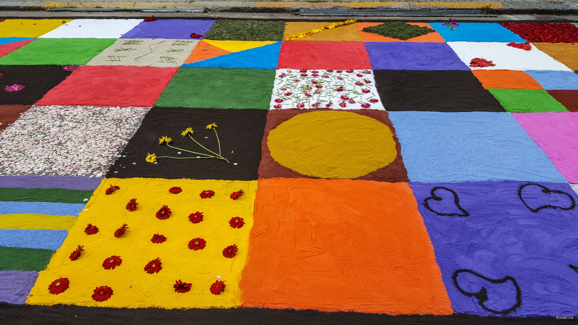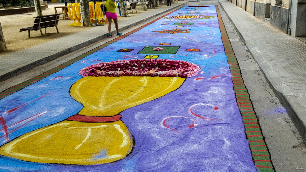 Alex Exler: В воскресенье в нашем городке, как обычно каждый год, было перекрыто несколько улиц, на которых прямо на асфальте выкладывали композиции из цветов и цветного песка. Традиция такая. Очень симпатичная, как и многие другие местные традиции.