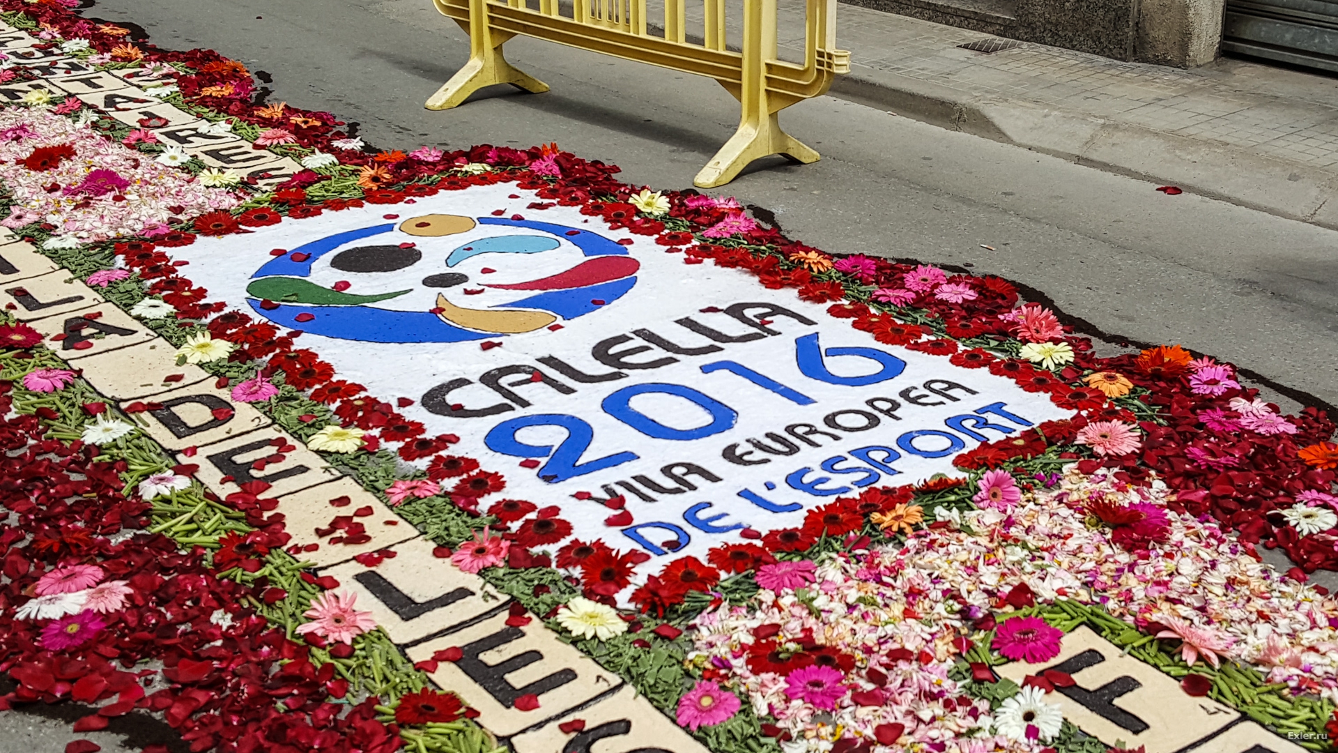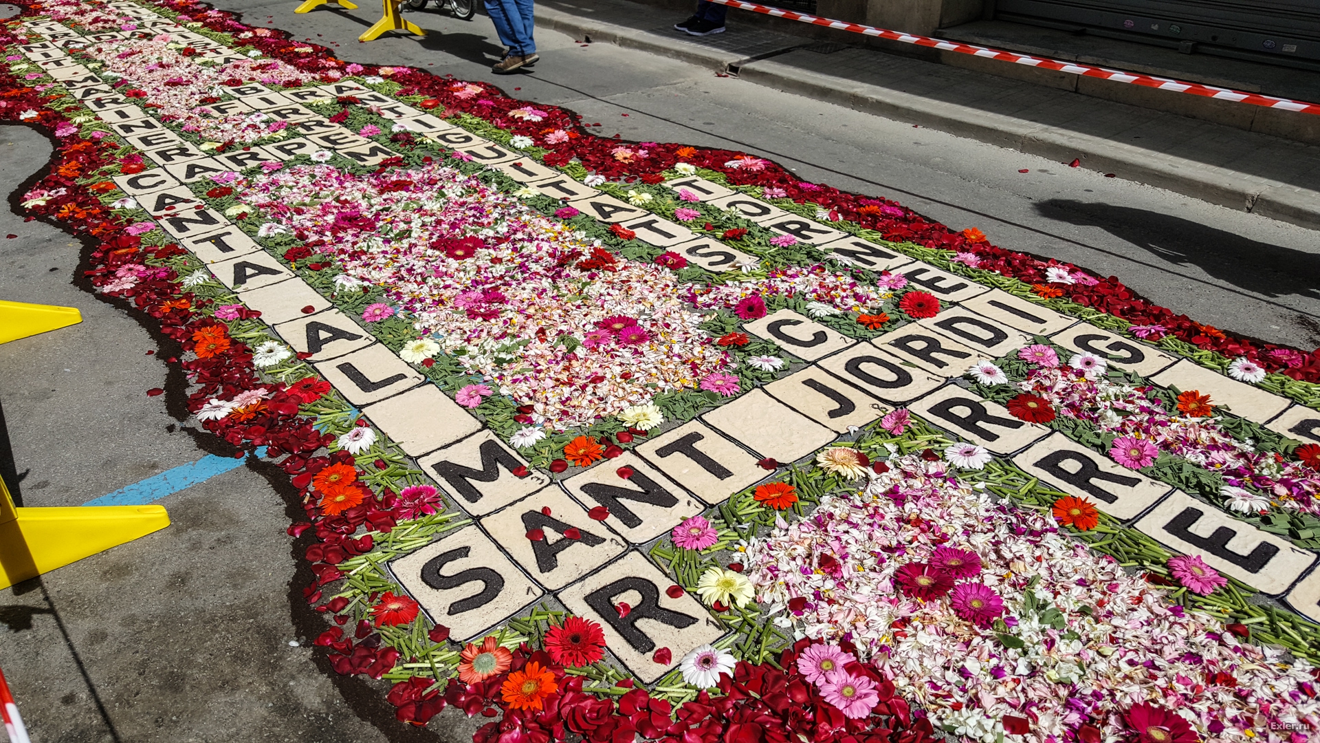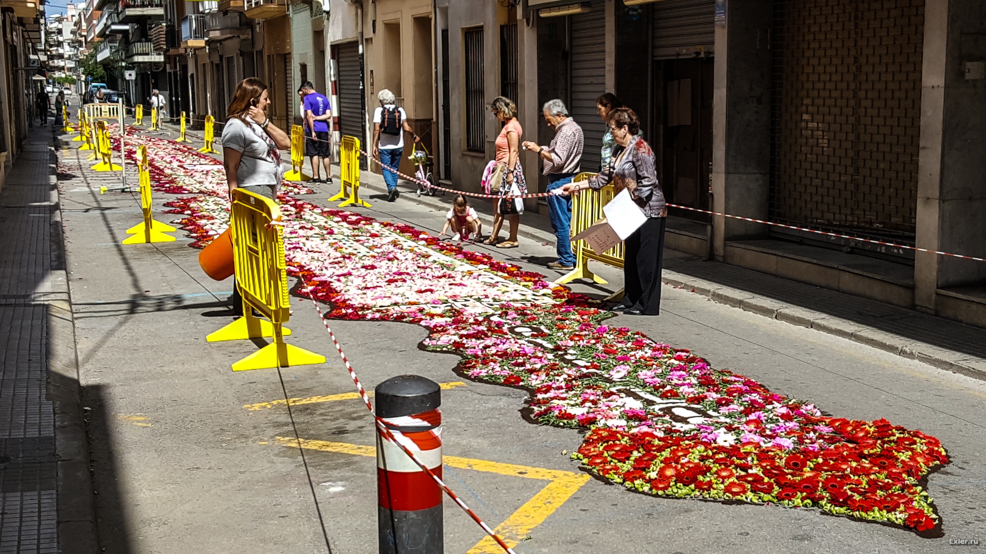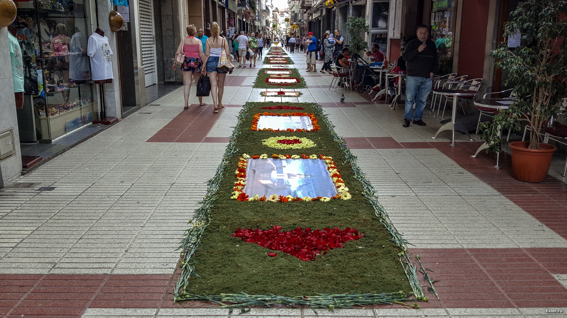 Alex Exler: В воскресенье в нашем городке, как обычно каждый год, было перекрыто несколько улиц, на которых прямо на асфальте выкладывали композиции из цветов и цветного песка. Традиция такая. Очень симпатичная, как и многие другие местные традиции.