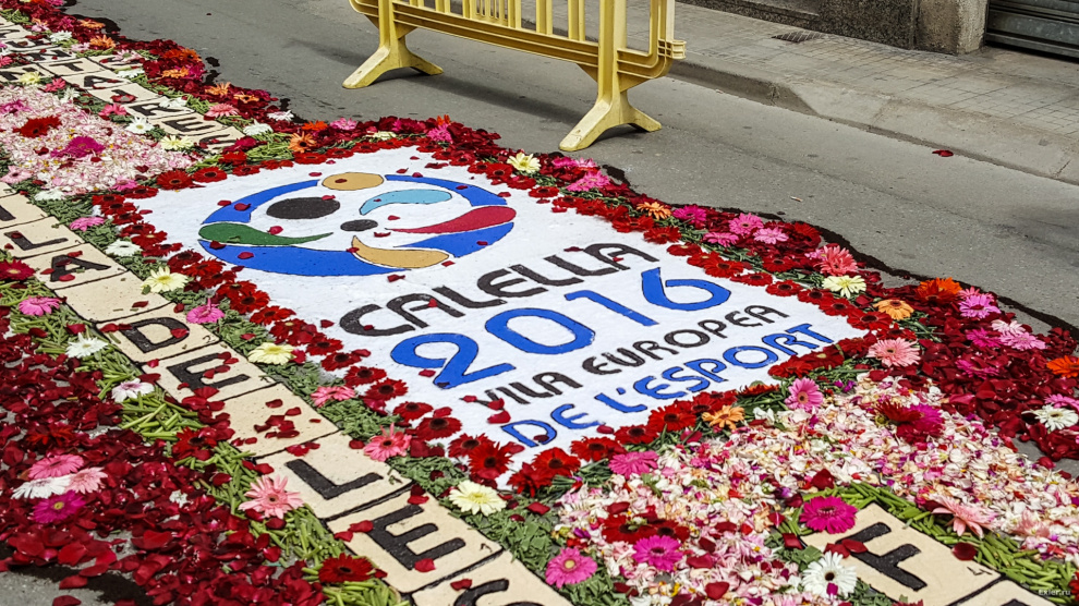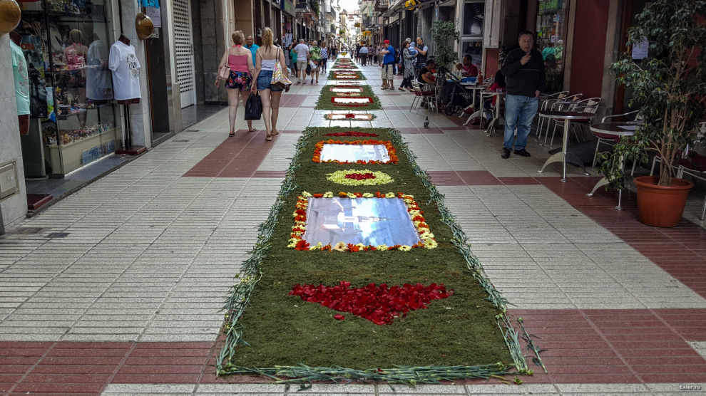 В воскресенье в нашем городке, как обычно каждый год, было перекрыто несколько улиц, на которых прямо на асфальте выкладывали композиции из цветов и цветного песка. Традиция такая. Очень симпатичная, как и многие другие местные традиции.