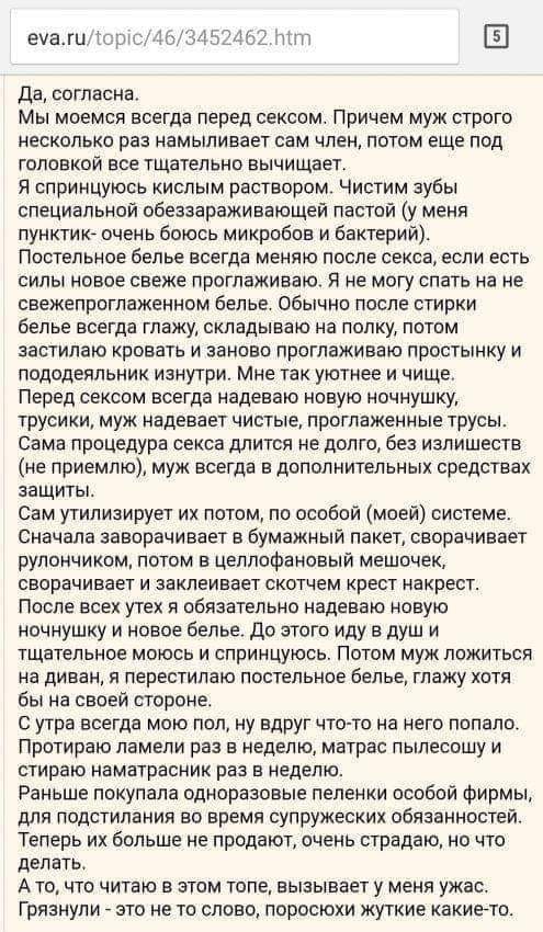 Даме, конечно, голову проверить надо, явный психоз и навязчивое состояние. Впрочем, если её и мужа всё устраивает - то и хрен с ней 😄
