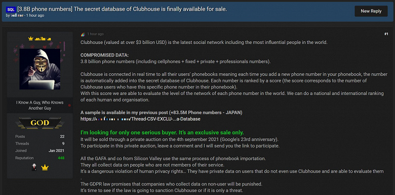 Вот это номер. И мне прям интересно - а Clubhouse не грозят неприятности за то, что телефонные номера их пользователей слиты и продаются? Ну и факт того, что они еще и собирали телефоны людей из телефонных книг своих пользователей - это вообще, конечно, какая-то совершенно дикая история.
