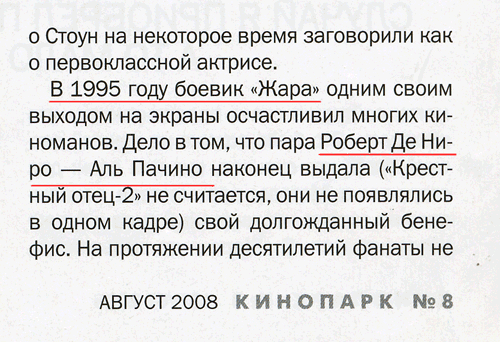 Листал тут как-то от скуки журнал "Кинопарк" (он у меня как бесплатное приложение к "МК-Бульвар" приходит). Читаю статью о Де Ниро (явно просто переведенную откуда-то) и натыкаюсь на следующую странную фразу: